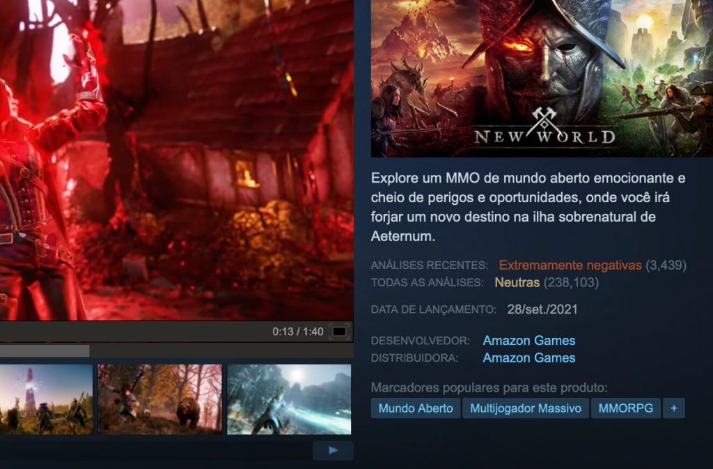 Como os fãs do famigerado New World bem sabem, a Amazon Games anunciou uma “versão repaginada” do game há alguns dias e acabou causando muitas confusões, com um press release que não explicou muita coisa e descrições pouco objetivas. E, claro, a galera gamer já começou a reagir ao anúncio do chamado New World: Aeternum. Para você ter uma ideia, desde o dia do anúncio para cá, a quantidade de reviews negativos na Steam cresceu de forma assustadora… vamos conferir?