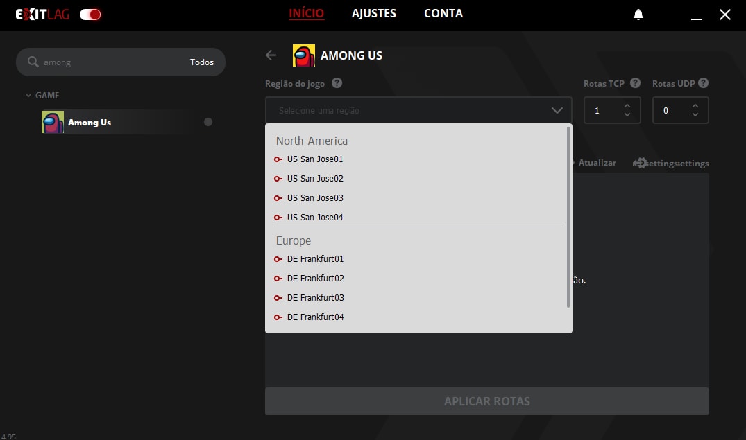 4. Escolha as rotas mais apropriadas. Com o game selecionado, no caso do Among Us, você, portanto, precisa selecionar o servidor mais apropriada para jogar o game. Em outras palavras, o servidor em que o game está hospedado, no caso Estados Unidos. Em “Região do Jogo”, selecione a rota com o menor ping. No meu caso foi a “US SanJose01“. Em “RotasTCP” certifique-se de selecionar 2.