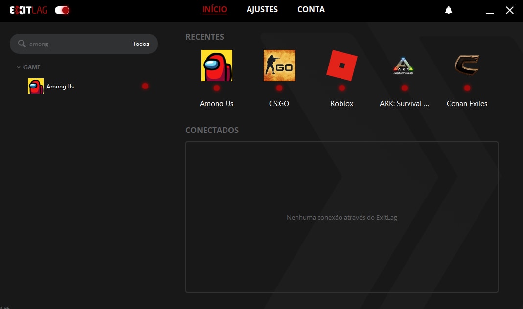 3. Escolha o jogo para diminuir o lag. Com o programa aberto, você será apresentado à Página Inicial do ExitLag. Aqui, tudo que você precisa fazer é digitar Among Us no campo “Buscar” para encontrá-lo facilmente. Então, basta clicar encima do nome do jogo para abrir a sua página de otimização.