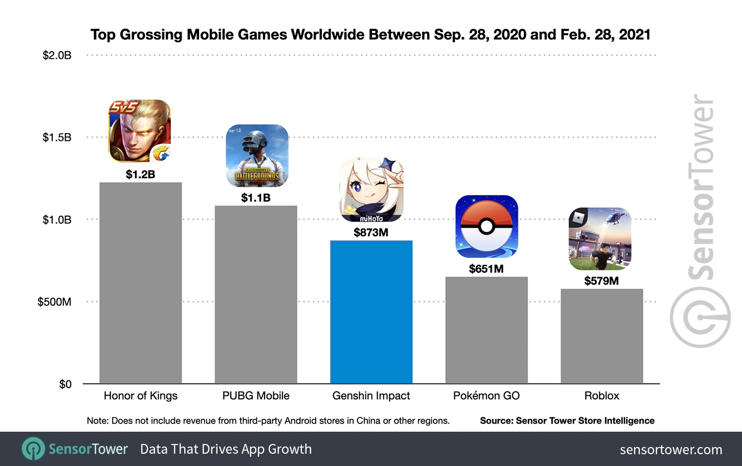No período de cinco meses, Genshin Impact fica atrás apenas de Honor of Kings e PUBG Mobile em número de receita total. Ambos os jogos alcançaram mais de US$ 1 bilhão no período. O game da miHoYo aparece na frente de títulos bem sucedidos e populares mundialmente como Pokémon GO da Niantic e Roblox da Roblox Corporation. Com isso, Genshin Impact é o RPG mobile mais rentável do mundo, trazendo uma receita estimada de US$ 175 milhões por mês apenas nos dispositivos móveis. O título também está disponível para PC e Playstation 4.
