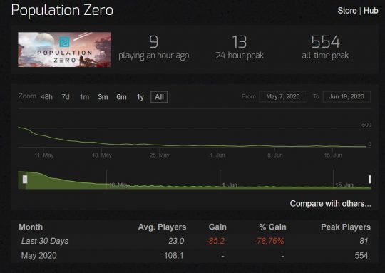 Population Zero estreou no mercado com a promessa de ser um jogo que “mudaria a nossa ideia de MMOs de sobrevivência”. As expectativas eram grandes, mas como muitas vezes acontece, a realidade acabou sendo impiedosa. Nas últimas 24 horas, o game registrou pico de apenas 13 jogadores online. O pior é que não há nenhuma expectativa que o título possa reverter essa situação, o modelo de negócio buy-to-play e as avaliações também não ajudam.