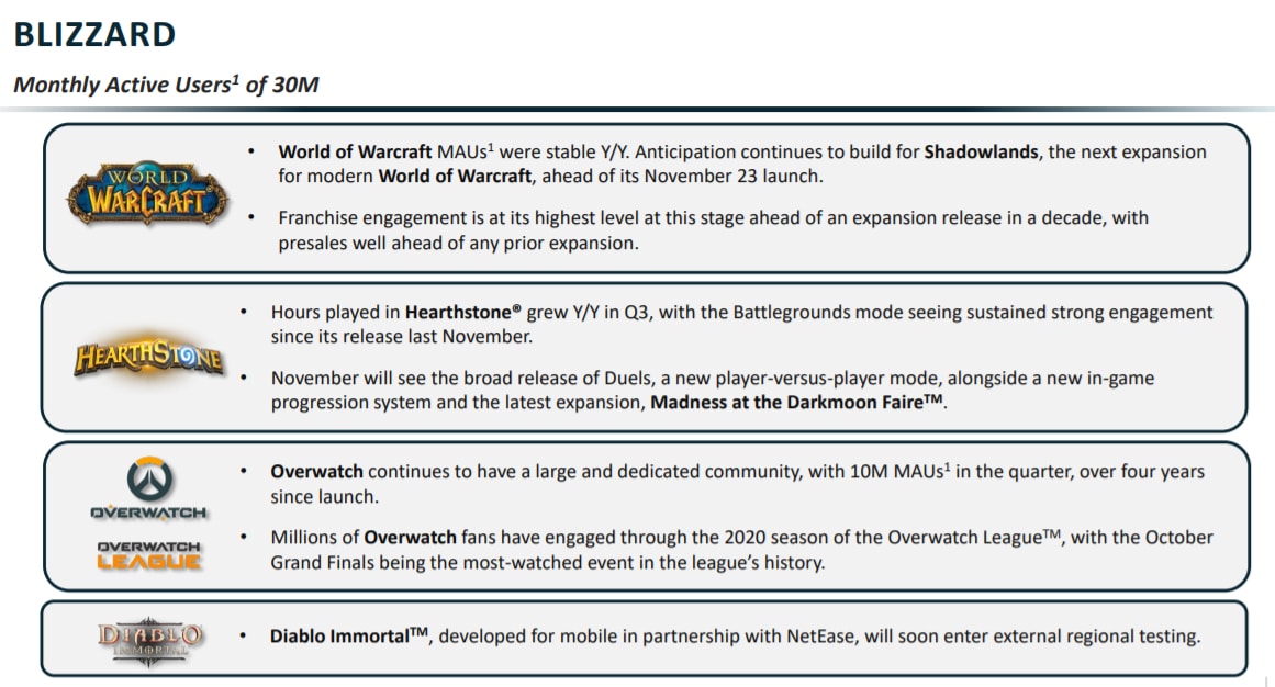 Já no lado da Blizzard, a empresa registrou US$ 443 milhões em receita impulsionado pelo forte trimestre de World of Warcraft — o valor representa um crescimento de 4% sobre o mesmo período do ano passado. Curiosamente, a Blizzard perdeu MAUs (jogadores ativos mensalmente) nesse último trimestre, mas World of Warcraft se manteve “estável” — não foi apresentado números. Ao todo, a Blizzard teve 30 milhões de jogadores ativos mensalmente em seus jogos (no 2° trimestre de 2020 eram 32 milhões).