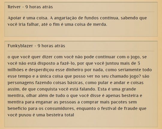 Contudo, apesar de a maioria dos comentários serem de críticas ao fundador da Soulbound Studios e a gerência, alguns agradeceram. Uma pessoa disse que sabia que estava investindo na ideia do jogo. Para mais informações, acesse página.