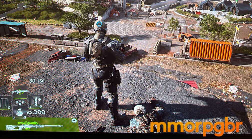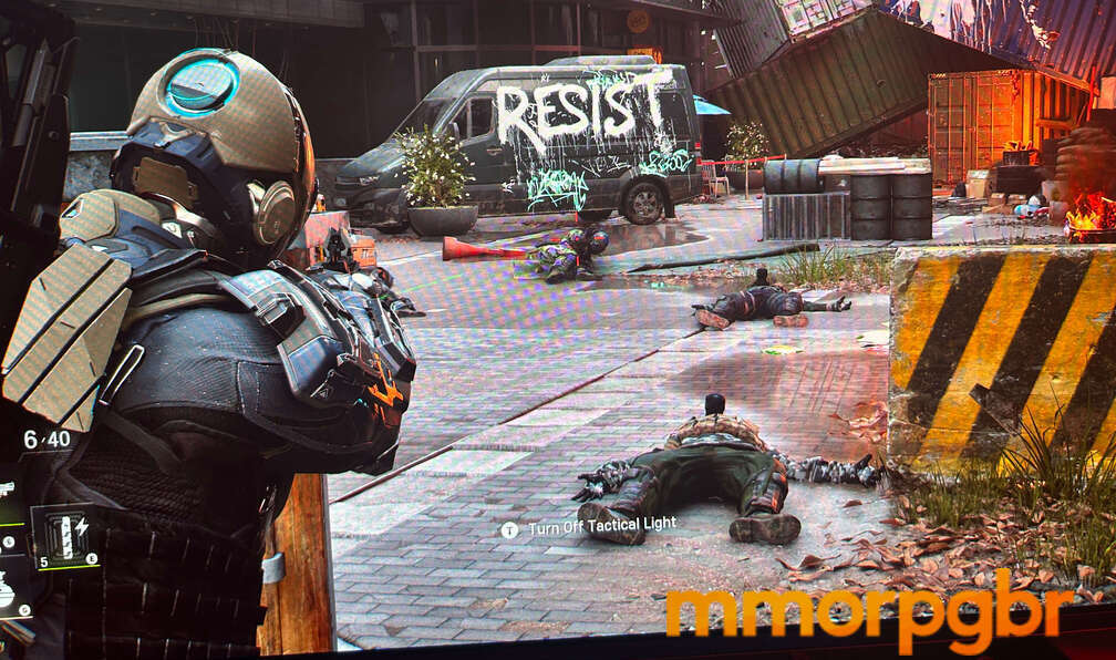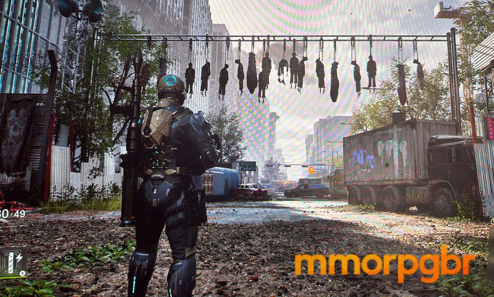 De modo geral, Cinder City me passou a impressão de um The Division em versão next-gen, especialmente pela ambientação urbana detalhada e pelo foco em ação tática. A gameplay — testada em um modo singleplayer — fluiu muito bem, com inimigos que exigem atenção constante: alguns vestem armaduras que só cedem quando atingidas em pontos específicos, enquanto outros carregam explosivos e forçam esquivas rápidas para evitar danos maiores. O que realmente se destacou, porém, foi o nível de brutalidade do combate; membros sendo arrancados e corpos pendurados em partes do cenário criam uma atmosfera pesada e caótica que reforça o tom pós-colapso do jogo.