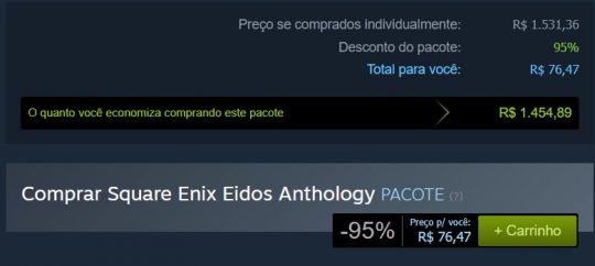 Square Enix Eidos Anthology inclui jogos incríveis de franquias como Sleeping Dogs, Tomb Raider, Just Cause, entre outros. Na compra do pacote com 95% de desconto, saindo por R$ 76,47, você vai economizar nada menos que R$ 1.454,89.