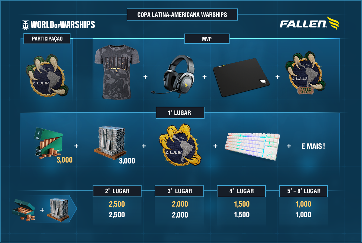 Cada um dos membros da equipe vencedora serão premiados com um Teclado Gamer Mecânico Fallen Ace – Switch Black, um keycap e moeda comemorativa personalizada pelo World of Warships, além de um brasão de vencedor do torneio e 3.000 Dobrões e Aço, a moeda do jogo. Já as equipes que terminarem a competição do 2° ao 8° lugar, receberão Dobrões e Aço como prêmio, mas em valores menores: