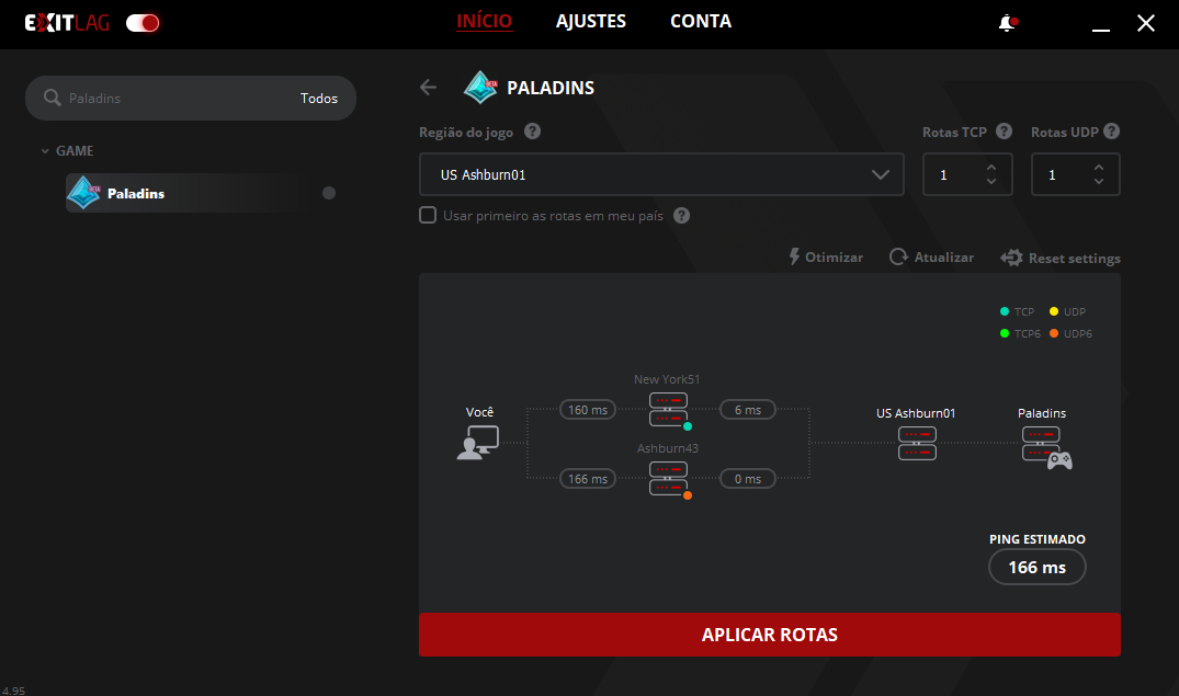 3. Escolha o jogo para reduzir o lag. Quando se conectar a sua conta, você será apresentado à Página Inicial do ExitLag. Aqui, o que você precisa fazer é procurar por Paladins no campo “Buscar” e selecionar a opção “Paladins”. Então, selecione “US Asburn01″ como região do jogo, tendo em visto que o servidor do game está localizado nesta região. Você pode conferir a latência estimada da região selecionada. Depois basta clicar em “Aplicar Rotas” e abrir o game para o programa começar a trabalhar para diminuir o lag e os travamentos em Paladins. Lembre-se também de fechar outros aplicativos que possam “sugar” sua internet.