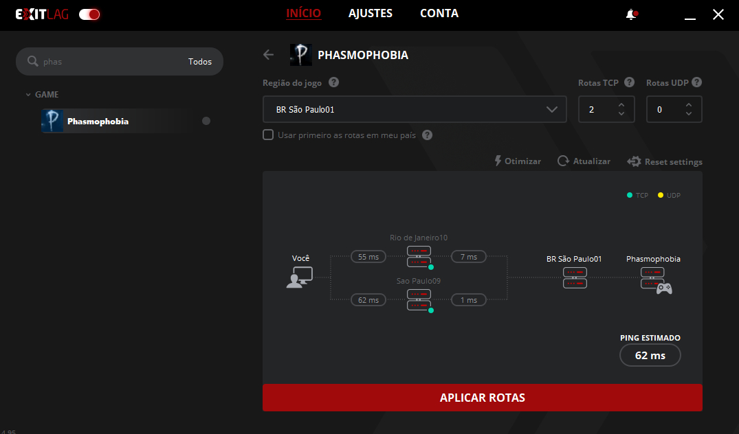 3. Escolha o jogo para reduzir o lag. Quando se conectar a sua conta, você será apresentado à Página Inicial do ExitLag. Aqui, o que você precisa fazer é procurar por Phasmophobia no campo “Buscar”. Então, selecione “BR São Paulo01” como região do jogo, tendo em visto que o servidor do game está localizado nesta região. Você pode conferir a latência estimada da região selecionada — seleciona outra região, caso a latência esteja mais baixa para você. Depois basta definir digitar “2” em “Rotas TCP” e clicar em “Aplicar Rotas”. Abra o game com o programa aberto.