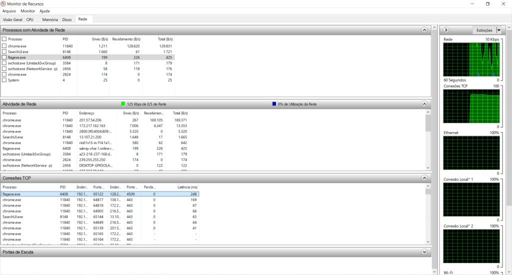 Clique na aba “Rede” e localize o aplicativo do Ragnarok Transcendence, no caso RagExe.exe. Ao deslizar a barra de rolagem para baixo, caso a janela não esteja em tela cheia, você pode conferir na seção “Conexões TCP” a latência do programa (278 ms). A latência alta deve-se principalmente à distância dos servidores do game, que são localizados na América do Norte.