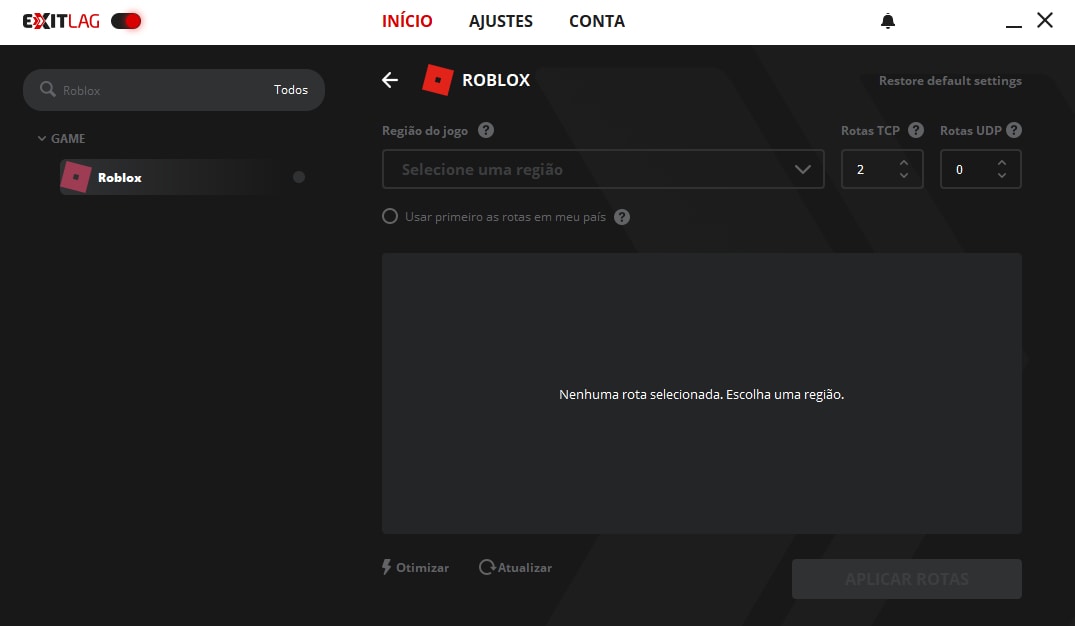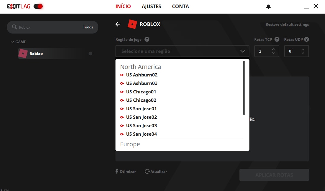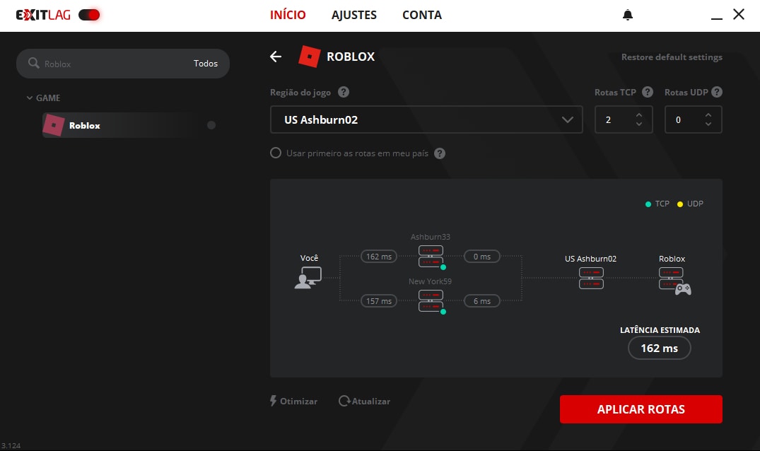 5. Diminuir o lag. Depois de selecionar a região, você pode conferir a latência estimada da rota que você terá ao jogar o game. Agora, basta clique em “Aplicar Rotas” para que sua conexão em Roblox seja otimizada, diminuindo o lag e oferecendo uma experiência mais estável. Após fazer isso, inicie o game normalmente com o ExitLag aberto.