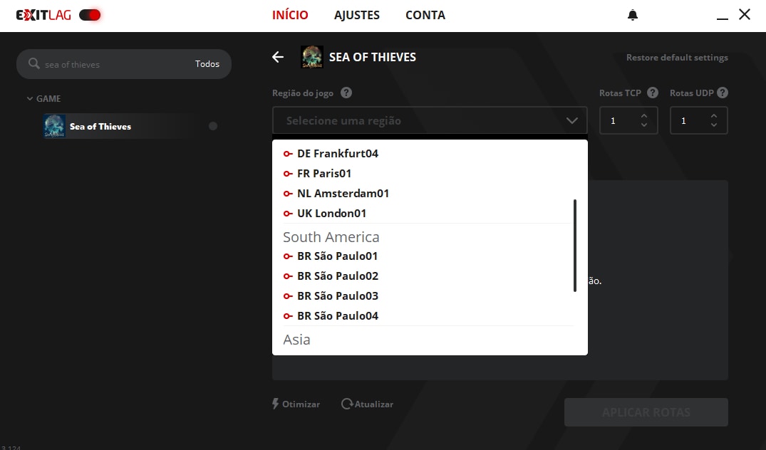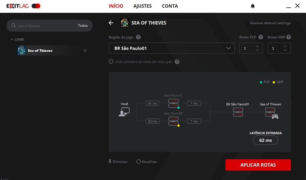 5. Diminuir o lag. Depois de selecionar a região, você pode conferir a latência estimada da rota que você terá ao jogar o game. Agora, basta clique em “Aplicar Rotas” para que sua conexão em Sea of Thieves seja otimizada, diminuindo o lag e oferecendo uma experiência mais estável. Após fazer isso, inicie o game normalmente com o ExitLag aberto.