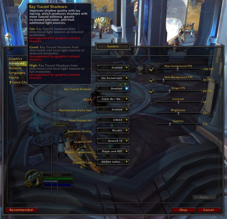 De acordo com o site WoWhead, as configurações do Ray Tracing em World of Warcraft já podem ser vista no menu do Alpha de Shadowlands, contudo ainda não está disponível para os jogadores ativarem. Confira a imagem abaixo: