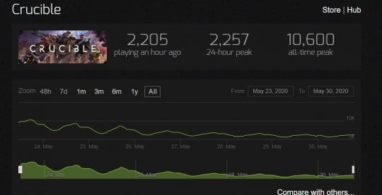 De acordo com a crítica especializada, Crucible falhou totalmente em causar um impacto no mercado de games até o momento, e caso não haja uma onda aleatória de interesse, pode seguir o destino de outros jogos do mesmo estilo. No Steam, o título, desenvolvido pela Rentless Studios, subsidiária da Amazon, tem apenas 45% de suas avaliações positivas e conta com média de 3.800 players online simultaneamente (devido ao pico de players no lançamento), contudo, nos últimos dias esse número não tem passado de 2.500 players.