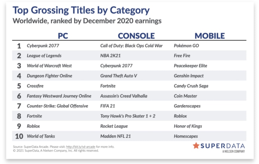 A SuperData Research, empresa que analisa o mercado de games, divulgou mais uma lista com os jogos mais rentáveis do mês. Em dezembro, Cyberpunk 2077 foi lançado e surgiu já liderando a lista, ultrapassando League of Legends, World of Warcraft (jogo mais rentável de novembro), e Dungeon Fighter Online. De acordo com a empresa, Cyberpunk 2077 teve o maior lançamento de um game da história considerando a sua receita digital e unidades digitais vendidas.