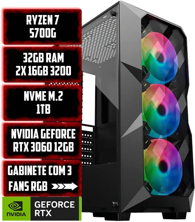Entre os pontos fortes da configuração, o PC chega equipado com o AMD Ryzen 7 5700G, processador capaz de encarar jogos atuais e tarefas exigentes com muita folga. O conjunto é reforçado por 32 GB de RAM DDR4 3200 MHz em dual channel, garantindo fluidez mesmo com vários programas abertos, além de um SSD NVMe de 1 TB que praticamente elimina tempos de carregamento. Já a RTX 3060 de 12 GB entrega ótimo desempenho em 1080p e 1440p, com direito a ray tracing, enquanto o gabinete com lateral em vidro e três fans RGB melhora a circulação de ar e adiciona um visual gamer mais caprichado ao setup.