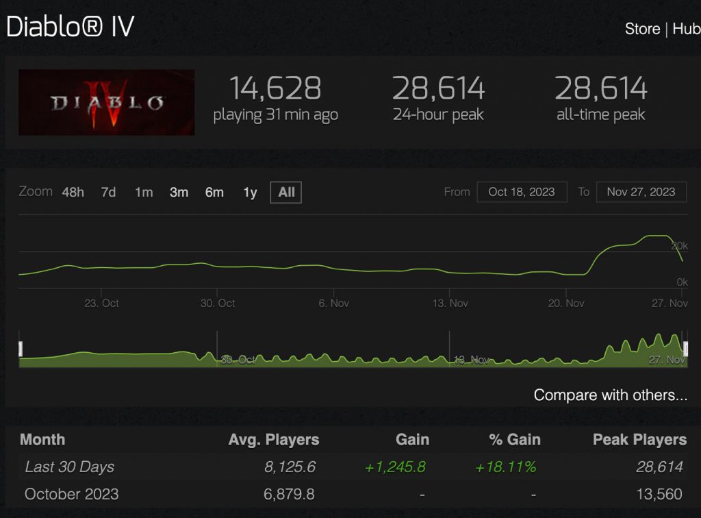 Pelo contrário, se formos comparar os novos números de Diablo IV com lançamentos deste ano, os resultados deixam de ser impressionantes. Por exemplo, nas últimas 24 horas, o surpreendente Lethal Company registrou um pico de mais de 184 mil jogadores simultâneos e esse game foi criado por um único desenvolvedor. Enfim, parece que o game da Blizzard não conseguiu “cair nas graças dos players”, mas agora está registrando alguns números mais interessantes. Logicamente, teremos que aguardar pelo fim das ações promocionais que estão rolando no momento, com vistas a saber se os novos jogadores que decidiram apostar na aventura vão continuar se dedicando a ela.