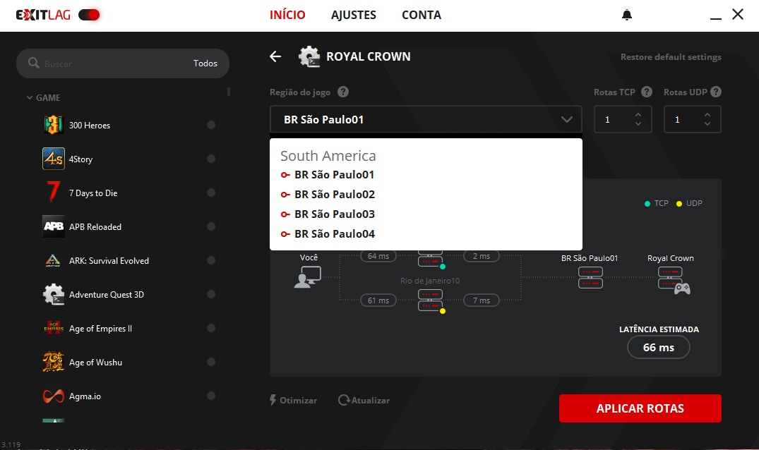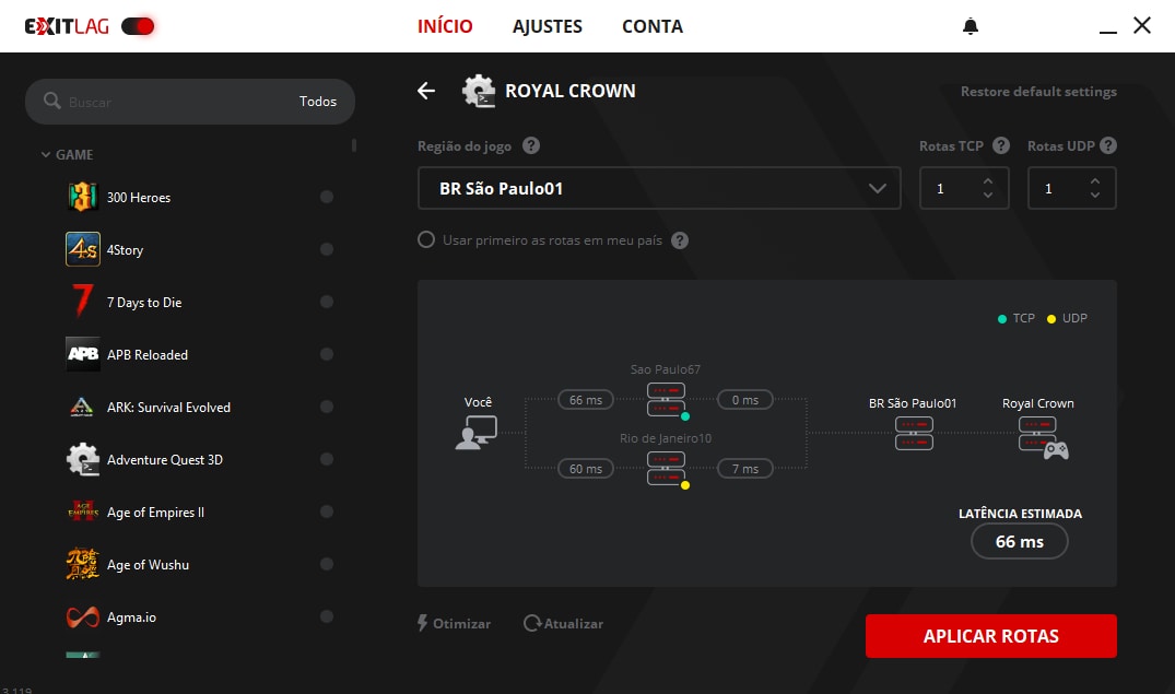 5. Diminuir o lag. Depois de selecionar a região, você pode conferir a latência estimada da rota que você terá ao jogar o game. Agora, basta clique em “Aplicar Rotas” para que sua conexão em Royal Crown seja otimizada, diminuindo o lag e oferecendo uma experiência mais estável. Após fazer isso, inicie o game normalmente com o ExitLag aberto.