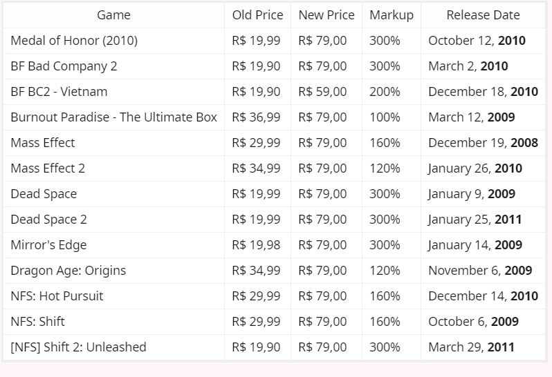 Como apontado por um usuário do Reddit, jogos antigos como Medal of Honor (2010), Dead Space, Dead Space 2, Mirrors Edge, que antes custavam R$ 19,99 passaram a custar R$ 79,00 (um aumento de 300%). Os mesmos games no Origin continuam com os preços antigos até o momento.