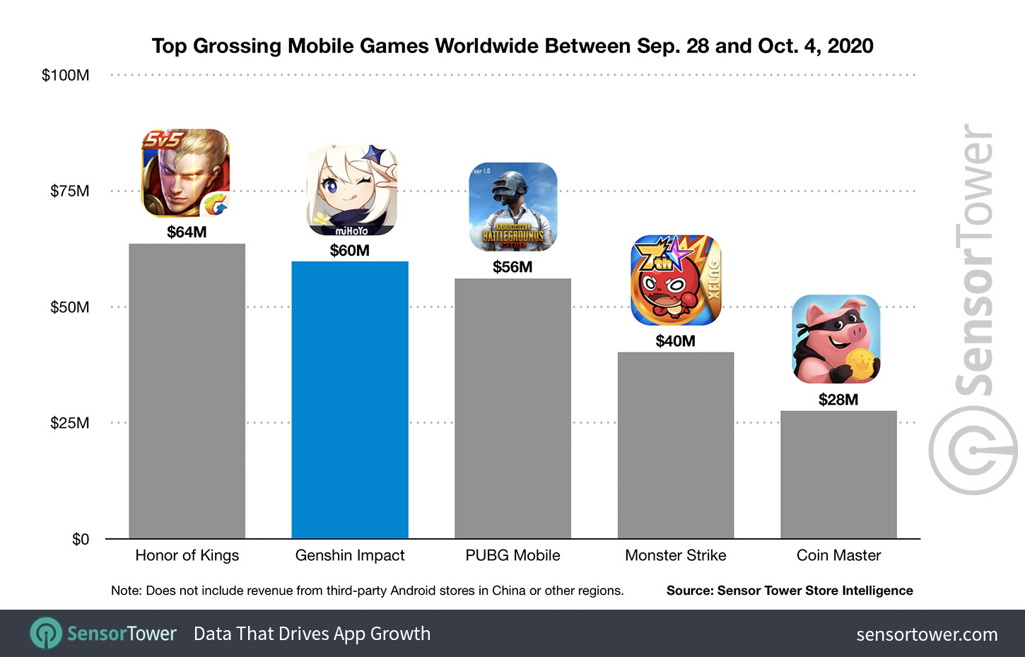Ainda segundo o SensorTower, Genshin Impact provou ser extremamente popular em todo o mundo. Na China, quase US$ 25 milhões foram gastos no game até o momento nos celulares, o que representa 42% de sua receita total. Entretanto, o game gerou mais receita no exterior, com as vendas chegando a US$ 35 milhões, ou 58% de sua receita total. A China é o país onde os jogadores mais gastaram com o game, seguido pelo Japão (US$ 17 milhões) e Estados Unidos (US$ 8 milhões).