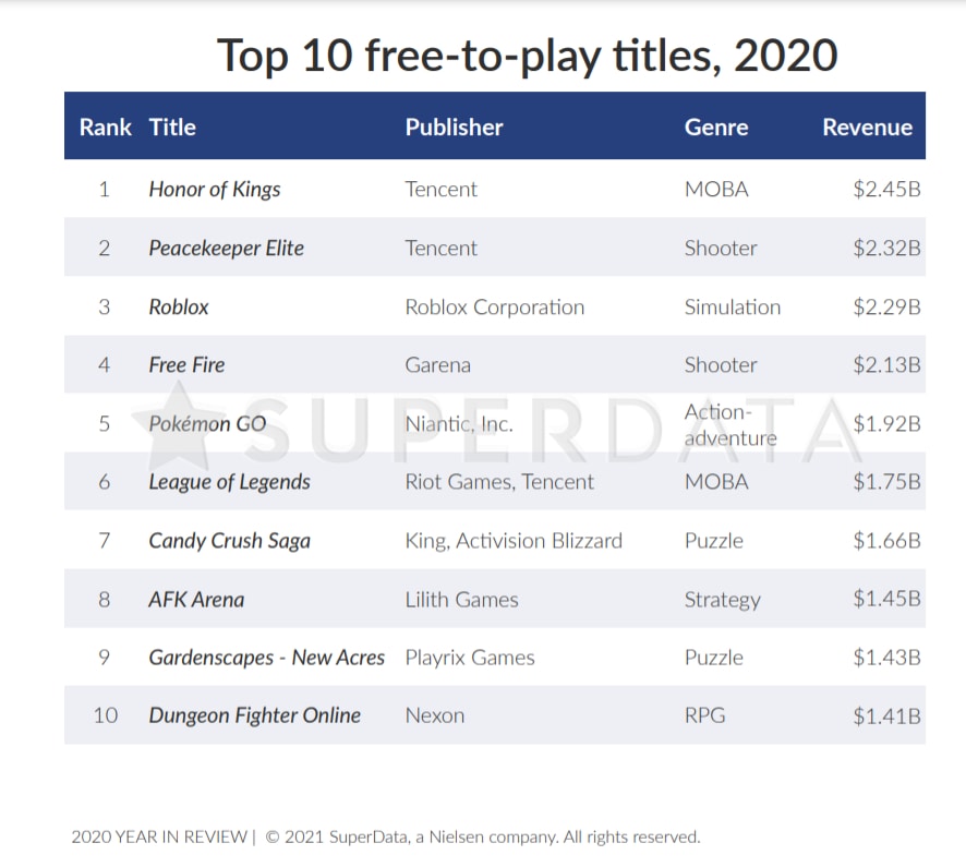 A empresa também revelou uma lista com os títulos Free-to-play mais rentáveis de 2020. A conclusão é que os jogos mobile continuam dominando o segmento com 8 dos 10 títulos aparecendo entre os mais rentáveis do ano. O único jogo para PC entre os 10 títulos mais rentáveis é Dungeon Fighter Online, um MMORPG 2D de luta bastante popular na China. O título é considerado o jogo mais rentável de todos os tempos em receita total, rendendo mais de US$ 15 bilhões para sua desenvolvedora.