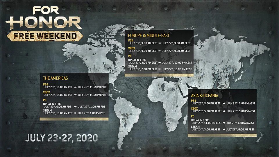 A Ubisoft anunciou que For Honor pode ser jogado gratuitamente neste fim de semana no PC, Xbox One e Playstation 4. Durante o período, os jogadores poderão assumir o papel de guerreiros poderosos, incluindo Vikings, Samurais, Cavaleiros e Wu Lin em uma grande variedade de campos de batalha e modos de jogo.