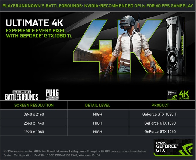 Com a resolução 1920×1080, a GeForce GTX 1060 atingiu uma média de 70 FPS e não ficou abaixo de 60 FPS, razão pela qual os desenvolvedores do game da PUBG Corporation fizeram da GeForce GTX 1060 a placa de vídeo oficial “recomendada”. Ao mesmo tempo, a 2560×1440, a GeForce GTX 1070 foi a primeira placa de vídeo a exceder 60 FPS, executando a uma média de 72 FPS, com uma mínima de 61 FPS. Além disso, os 4K mais exigentes precisaram da habilidade da GeForce GTX 1080 Ti, a placa de vídeo para consumidor mais rápida do mundo, que foi executada a 60 FPS com um pacote completo de configurações de alta resolução.