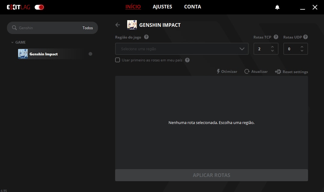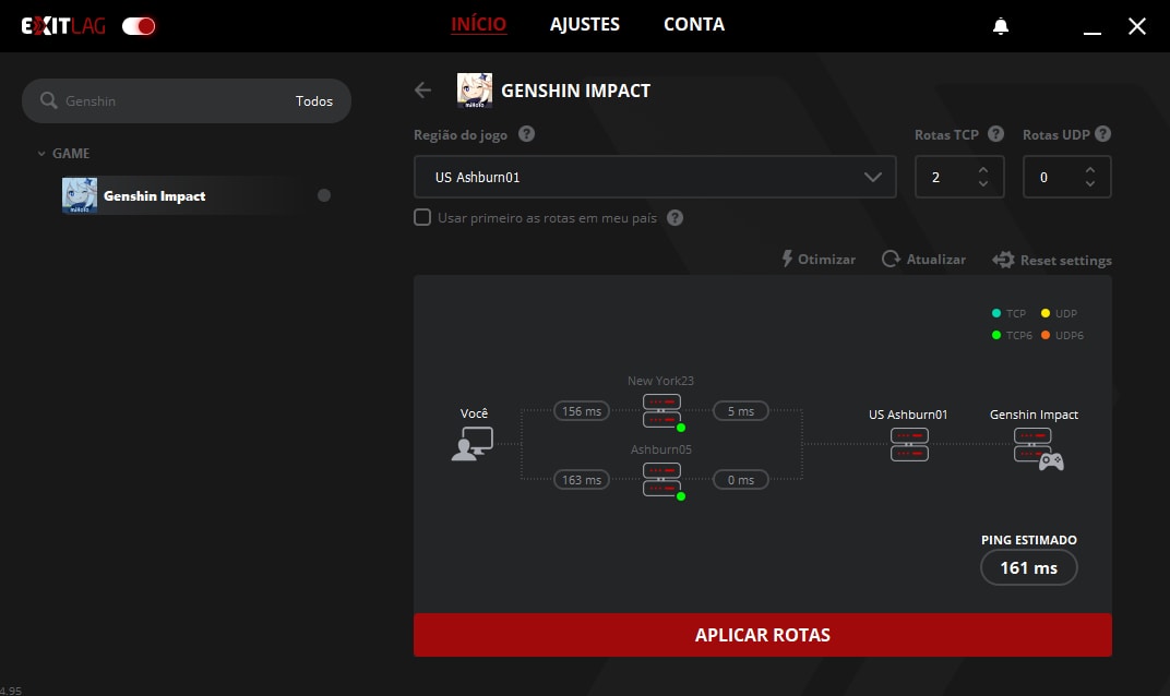 5. Diminuir o lag. Depois de selecionar a região, você pode conferir a latência estimada da rota que você terá ao jogar o game. Agora, basta clicar em “Aplicar Rotas” para que sua conexão em Genshin Impact seja otimizada, diminuindo o lag e oferecendo uma experiência mais estável. Após fazer isso, inicie o game normalmente com o ExitLag aberto. Se você voltar à janela do programa com o game aberto, poderá conferir as conexões otimizadas e a latência estimada em tempo real no espaço mostrado acima.