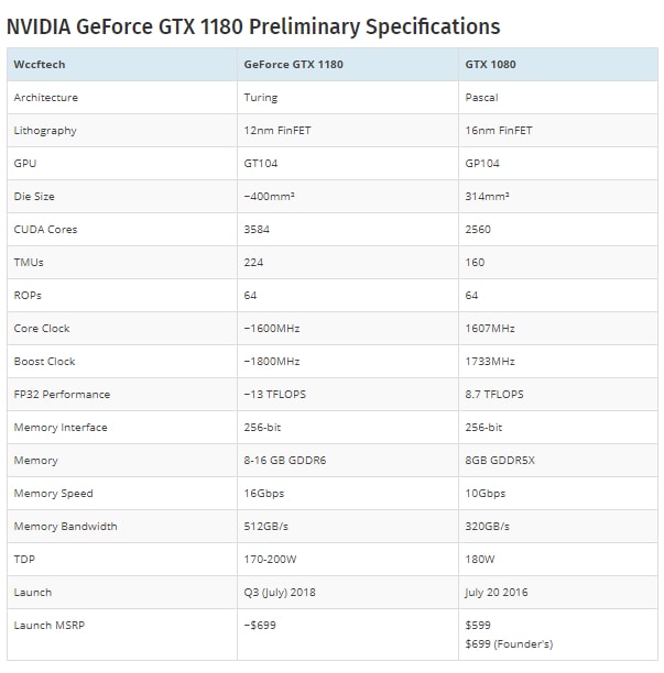Foram vazados os primeiros detalhes preliminares da nova placa de vídeo NVIDIA GeForce GTX 1180. Os detalhes dão conta que a placa é baseada na arquitetura Turing, apresenta 3584 cores CUDA, de 8 a 16GB de memória GDDR6 a 16bps numa interface 256-bit, além de ser alimentada pela GPU GT104.