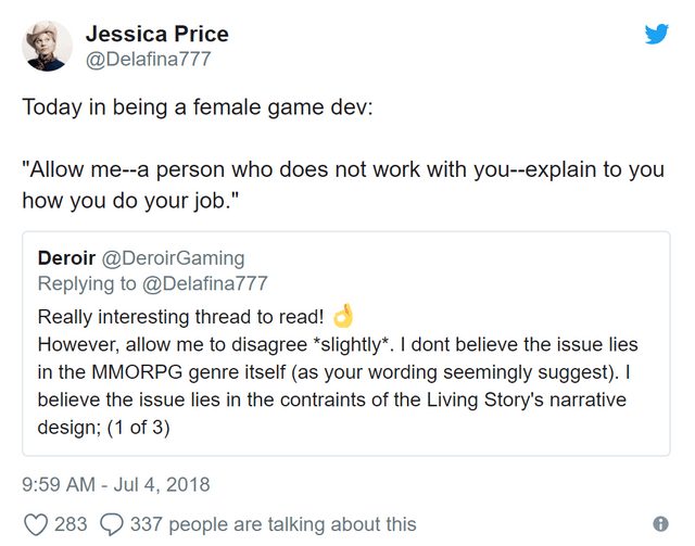 Jessica PriCe não foi demitida por conta do feminismo, nem por esse twitte que a matéria apresenta, nem por ser uma pessoa desagradável, o que custou seu emprego foi ter chamado dois dos maiores criadores de conteúdo (Deroir e Inks) de GW2 de bundões quando os dois tentavam conversar de maneira construtiva sobre a história do jogo. No geral era uma pessoa bem desagradável, a grande surpresa é que ela tenha sobrevivido ao caso da morte do totalbiscuit. O outro desenvolvedor demitido, Peter Fryes, era um cara bem quisto pela comunidade e sua ausência será sentida.