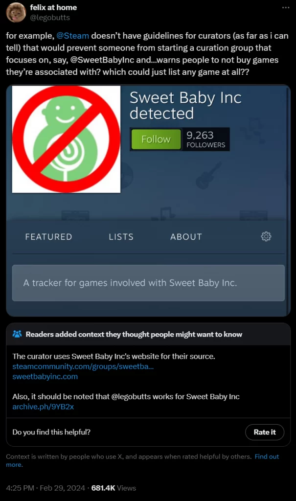 Apesar do compromisso declarado da empresa em promover diversidade e inclusão nas narrativas de jogos, alguns jogadores expressaram insatisfação com as decisões narrativas adotadas em alguns desses jogos. Essa insatisfação levou à criação de uma página pública de Curador no Steam, intitulada “Sweet Baby Inc Detected“, criada possivelmente por um brasileiro. O objetivo dessa página é informar os consumidores sobre os jogos na plataforma que contaram com o envolvimento da Sweet Baby Inc., marcando-os como ‘Não Recomendado’. Para embasar suas alegações, a página apresenta evidências, incluindo capturas de tela do site e das redes sociais da Sweet Baby Inc.