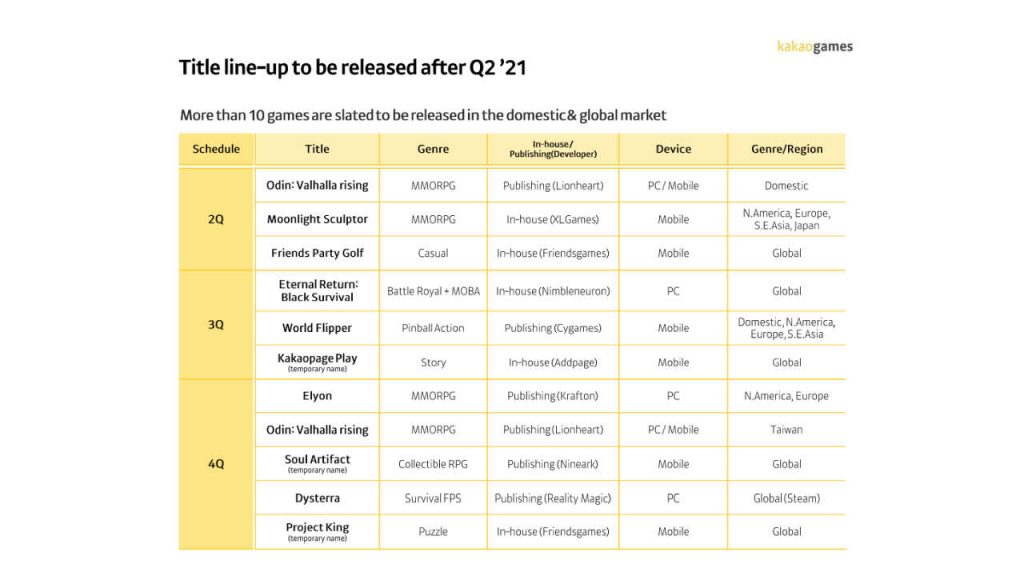 De acordo com os documentos liberados (que você poderá conferir logo abaixo do post), até o fim do ano, a Kakao Games pretende lançar dez games, sendo que três deles foram classificados como MMORPGs. Além disso, os planos também revelaram que há mais quatro títulos em processo de desenvolvimento inicial e três desses quatro estão previstos para ser lançados de forma global. No caso dos games que vão chegar ainda este ano, não tivemos muitas surpresas, no que diz respeito aos MMORPGs. Odin: Valhalla Rising será lançado na Coréia do Sul e em Taiwan, enquanto Elyon e Moonlight Sculptor terão versões para o Ocidente.