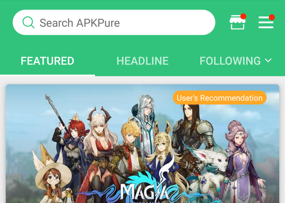 Após ter instalado o APK Pure, baixe o APK do LaPlace M em deus dispositivo através deste link. Feito isso, abra o aplicativo do APK Pure e clique no ícone das três barras no canto superior direito da tela, como na imagem abaixo: