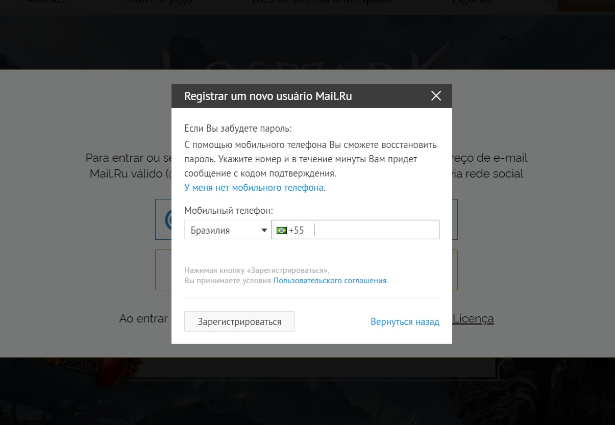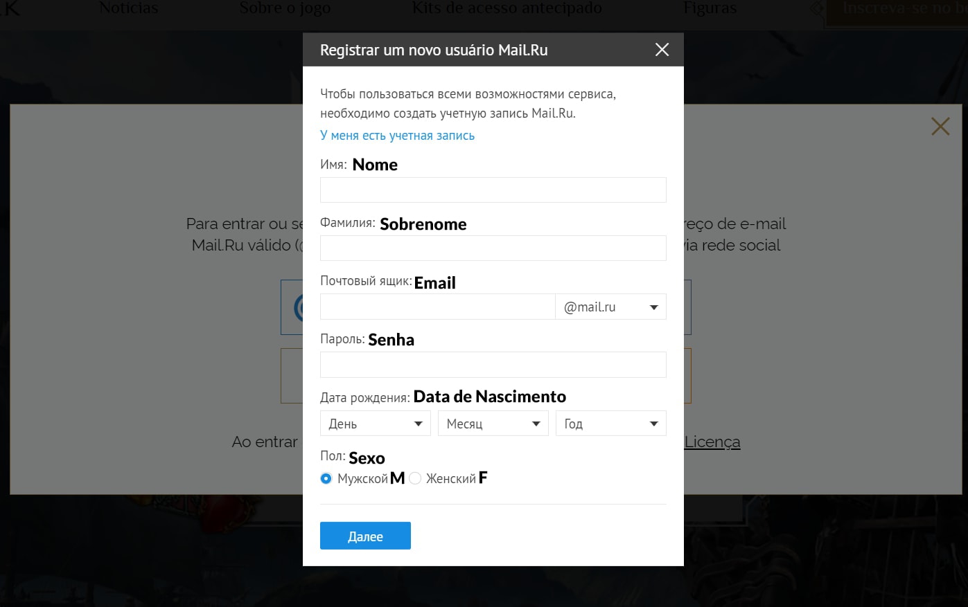 3.Após escolher mail.ru, clique em “registro” e preencha seus dados como na imagem abaixo: