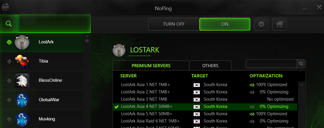 Com a conta já em mãos, é necessário realizar o download do Stove, no qual pode ser feito através desta página. Após concluído do download, instale o aplicativo. Agora, você vai precisar iniciar o NoPing. Com o NoPing iniciado e com seu login efetuado, selecione Lost Ark na lista de jogos. Após fazer isso, basta selecionar um dos servidores disponíveis e clicar em On para ativar a VPN como na imagem abaixo: