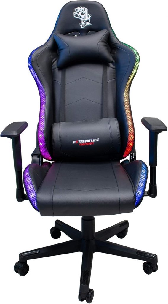 Dando início a esta rápida seleção focada nas melhores cadeiras gamer com LED, temos a elegante Seven Lions Neon. Essa cadeira apresenta uma construção muito interessante, com direito a um revestimento de alta qualidade e um sistema de iluminação RGB nas bordas. Desse modo, o produto acaba se destacando em qualquer setup. E, claro, como a estrutura é bem resistente e pode ser ajustada de várias formas, podemos dizer que ela vai acompanhar qualquer player por um bom tempo. Vale ressaltar que a espuma tem uma boa densidade e as almofadas que acomodam a lombar e a cervical cumprem suas funções primárias de forma eficiente. No fim das contas, essa é uma opção que acaba sintetizando a ideia básica da lista de uma forma muito adequada. Não deixe de conferir!