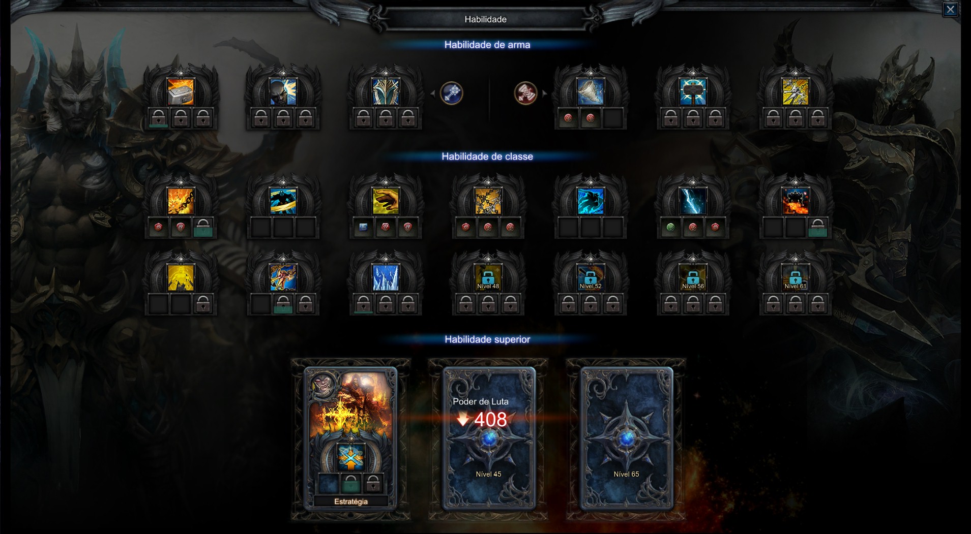 Novas habilidades são desbloqueadas em determinado nível até o 61 e são divididas pelo tipo de arma equipada podendo ser melhoradas de acordo com o uso em até 3 níveis, a cada nível um espaço para selo que proporciona bônus variados à essa habilidade é desbloqueado. Além disso existem 3 habilidades superiores (passivas) que podem ser destravadas no nível 25, 45 e 65.