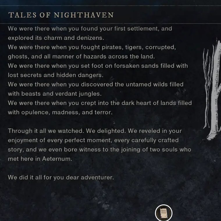 Nesse clima de despedida, alguns jogadores descobriram uma misteriosa nota escondida entre árvores e rochedos, próxima à “Tower of Strength”. Intitulado “The Spirit of Aeternum”, o texto parece se dirigir diretamente à comunidade, relembrando momentos marcantes da jornada — de batalhas épicas a terras esquecidas — e até mencionando o casamento de dois aventureiros que se conheceram dentro do jogo. O achado fez muitos acreditarem que se trata de uma “carta de despedida” deixada pelos desenvolvedores, um gesto simbólico para quem acompanhou New World desde o início. Mesmo sem confirmação oficial, a mensagem trouxe aquele tom nostálgico para os players.