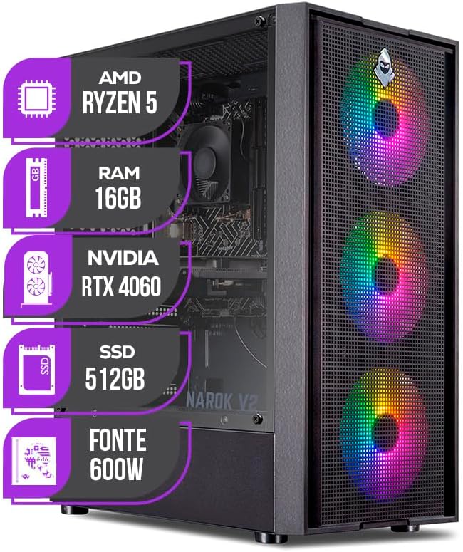 Para quem quer ir além do básico, este modelo traz o potente Ryzen 7 5700X, um processador de 8 núcleos que entrega desempenho excepcional tanto em jogos quanto em multitarefa pesada. Com 16GB de RAM, SSD NVMe de 1TB e RTX 4060 de 8GB, ele está pronto para rodar qualquer jogo atual com sobra, além de ser uma ótima escolha para quem trabalha com edição, modelagem 3D ou streaming. O gabinete com 3 fans RGB complementa o visual robusto e eficiente do sistema. Um verdadeiro topo de linha dentro do orçamento de R$ 6 mil.