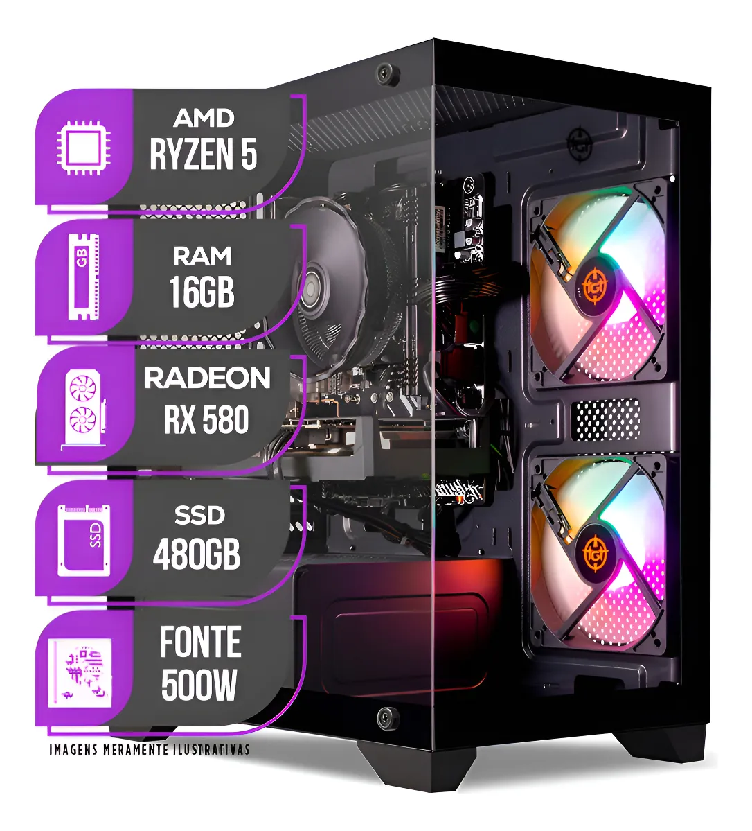 Elevando um pouco mais o nível, mas ainda focando em opções que podem funcionar como uma “porta de entrada”, temos um modelo que apresenta um processador AMD Ryzen 5 5600, 16GB de memória RAM, 480GB de SSD e uma GPU RADEON RX 580 (com 8GB de memória de vídeo dedicada). Em linhas gerais, esse PC já está bem posicionado para proporcionar experiências gamer bem mais interessantes e consegue rodar até alguns jogos pesados com configurações ajustadas. Detalhe: o gabinete que “envelopa” o conjunto pode acabar variando, em função da disponibilidade em estoque, mas os montadores do Pichau Group garantem que sempre vão procurar por um item igual ou superior ao exibido no anúncio. Portanto, podemos dizer que essa é uma das melhores opções que você pode encontrar atualmente, no que diz respeito à relação custo/benefício.
