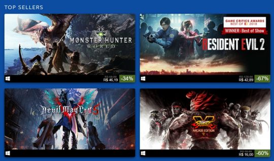 Monster Hunter World, que é um dos jogos mais jogados do Steam, pode ser comprado com 34% de desconto, saindo por R$ 46,19. Já o aclamado Resident Evil 2, que foi lançado no início de 2019, está disponível por apenas R$ 42,89 (67% off). Quem ama a franquia Resident Evil, também pode levar para casa o Resident Evil 4, 5 e 6 por apenas R$ 36,52 — o pacote antes custava R$ 169,90.
