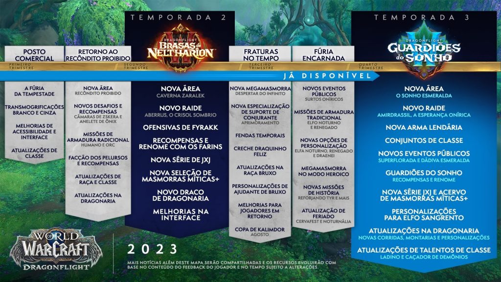Conforme foi explicado no release assinado pela Blizzard, a próxima atualização de World of Warcraft: Dragonflight vai se chamar Guardiões do Sonho e chegará logo após a BlizzCon 2023, no dia 07 de novembro. Como destaques, o pacote de conteúdo introduzirá uma nova área de exploração (com muitas missões, atividades e recompensas), um novo evento público, uma nova trilha de renome e diversas atualizações no sistema de dragonaria. Além disso, os devs confirmaram que vão promover ações de balanceamento nas classes e mudanças nas interfaces. Por fim, teremos adições de novos equipamentos, montarias e mascotes.