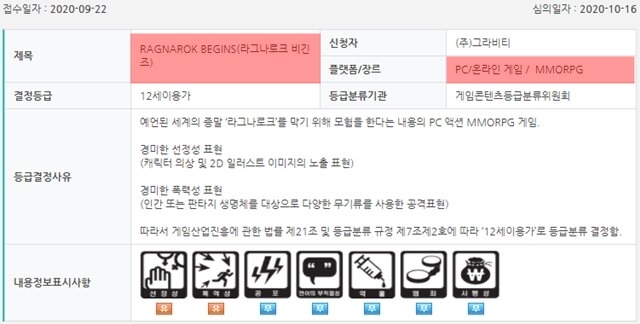 Ragnarok Begins, o 35° jogo baseado em Ragnarok, foi registrado com classificação indicativa para 12 anos na Coreia do Sul. Diferente dos outros jogos anunciados recentemente, o game, que aparentemente será desenvolvido pela própria Gravity, é um novo MMORPG exclusivo para PC.