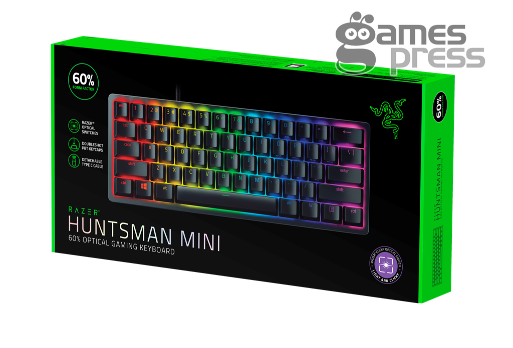 Embora possua apenas 60% do tamanho de um teclado normal, o Huntsman Mini mantém todas as teclas essenciais para jogos com funções normalmente atribuídas a teclas dedicadas em um teclado normal presentes como funções secundárias, impressas na lateral das teclas. O teclado também permite aos jogadores configurarem macros ou novas funções a qualquer tecla via Razer Hypershift no Razer Synapse 3.