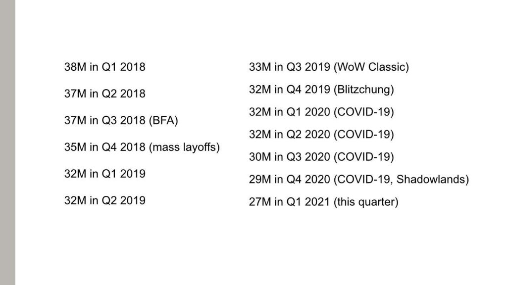 – As reclamações de queda de qualidade/criatividade e conteúdo em WoW desde a expansão WoD, onde jogadores começaram a reclamar que o jogo estava começando a abandonar aspectos importantes de interação social e jogo multimassivo.