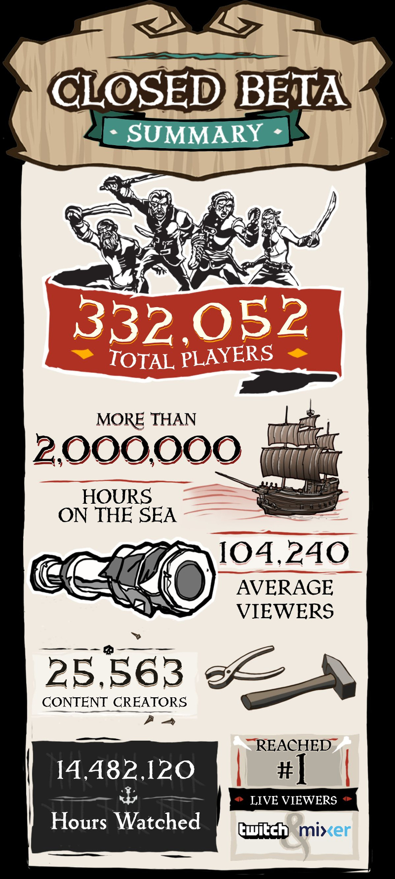 Foi divulgado um infográfico com os dados referentes ao Closed Beta de “Sea of Thieves”. Durante o período, um total de 332,052 se juntaram ao jogo, com mais de 2 milhões de horas de login no total.