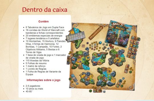 O jogo contará, claro que com tudo que há de melhor e as principais características de um produto Small Worlds, mas ainda com mecânicas adicionais, como mapa modular, sistema de alianças e muito mais para refletir o universo de World of Warcraft. Small World of Warcraft é um jogo de tabuleiro independente que se passa no glorioso universo de videogames da Blizzard, Azeroth. O qual 2 a 5 jogadores disputam o controle de várias ilhas neste mundo hostil e sua única esperança será escolher a combinação certa de raças e poderes especiais. O jogo em sua forma tradicional é habitado por um elenco de personagens como anões, bruxos, amazonas, gigantes, orcs e até humanos, que usam suas tropas para ocupar território e conquistar terras adjacentes, a fim de empurrar as outras raças para fora da face da terra. O jogo de tabuleiro tem previsão para ser lançado no fim do ano e estará disponível no Brasil nas principais lojas.