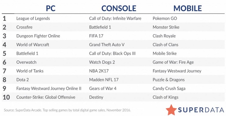 A última pesquisa realizada pelo SuperData reúne os 10 jogos mais rentáveis de novembro no PC, consoles e dispositivos móveis. De acordo com a pesquisa, no PC, “League of Legends” aparece sem surpresas ocupando o primeiro lugar da lista.
