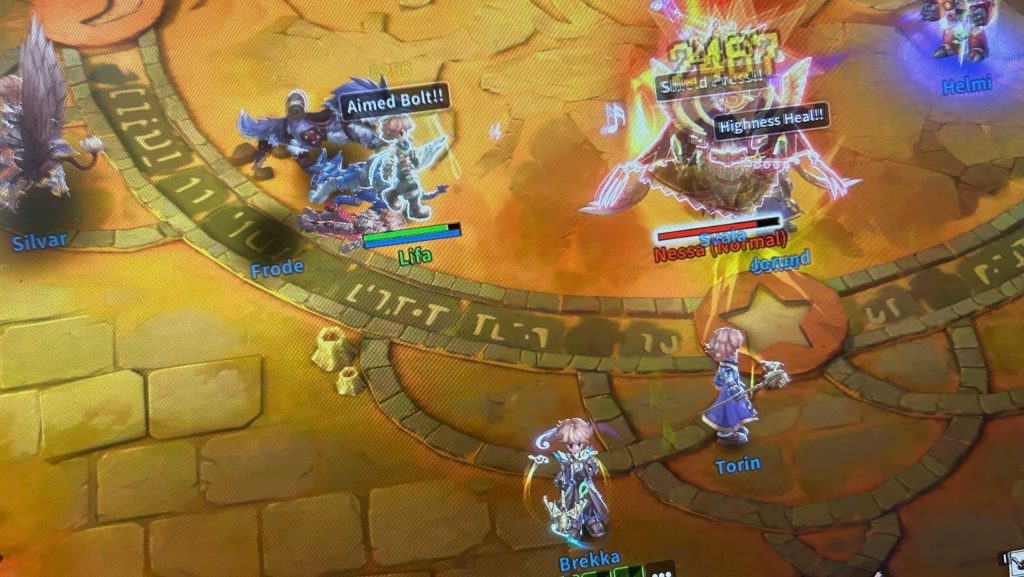 Depois de alguns minutos explorando os arredores de Prontera, fui convocado junto com o restante do grupo para a raid. Dessa vez, já estava bem mais confortável com os controles de movimentação no esquema WASD, o que ajudou bastante no posicionamento e evitou que eu tomasse muito dano logo no início da luta. As ações e habilidades ficam distribuídas entre as teclas Q, E e os atalhos 1, 2, 3 e 4, o que garante acesso rápido durante o combate — no começo soa um pouco estranho, mas com o tempo você se acostuma.