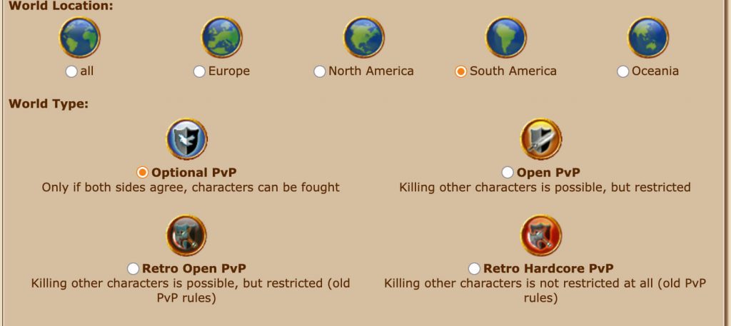• Escolha um nome para seu personagem, selecione um mundo (dê preferência a servidores localizados na América do Sul) e o tipo de servidor desejado: Optional PvP ou Non-PvP.