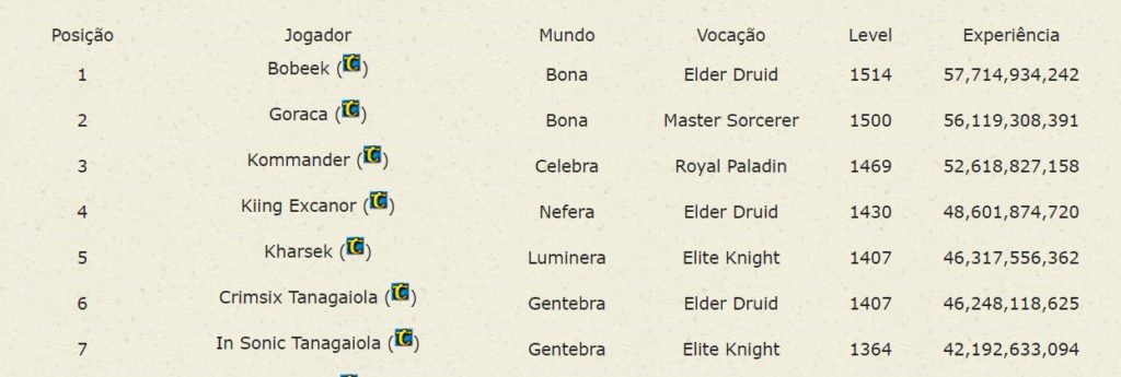 Atualmente o polonês Bobeek é o primeiro do ranking de level com 1514 níveis, seguido por sua parceira “Goraca”, que é Master Sorcerer e alcançou o nível 1.500 recentemente. Para chegar ao incrível level 1500, Boobeek, Elder Druid do mundo de Bona, precisou de mais de 56 bilhões em experiência e obviamente horas e horas de jogo — talvez o dia todo jogando. De fato, isso parece não ser problema para Boobeek e sua namorada, que upam com facilidade. Atualmente mais de 150 jogadores já atingiram o nível 1000, após a proeza de Kharsek em agosto de 2016.